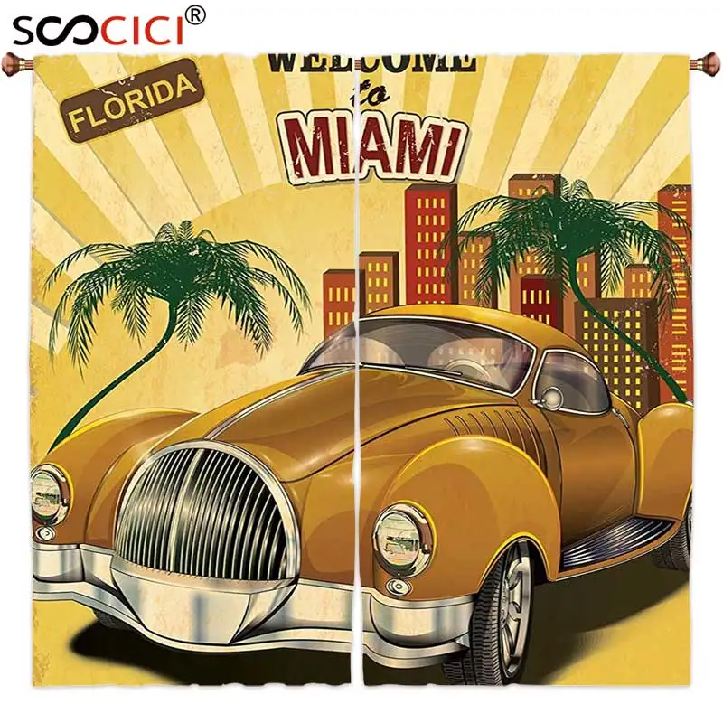 Special Price Gordijnen Behandelingen 2 Panelen, Vintage Decor Welkom om Miami boven Nostalgische Auto met Palmbomen en Stedelijke Appartement