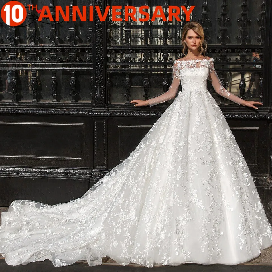 Beste prijs Ollymurs 2020 Luxe Trouwjurk Transparante Mouwen Hals 3D Decal Lace Bridal Trouwjurk Ondersteuning Maatwerk Korting